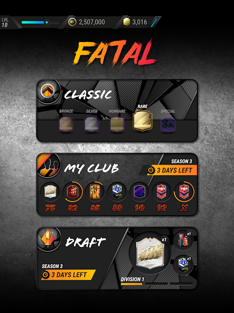 • FATAL My Club: use cards from your own collection to compete in eight Rating Series, each one with a different maximum rating requirement. Improve and change your teams whenever and however you want. New Rewards every week.