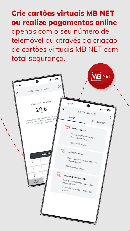 When paying for your online purchases, access the MB WAY app and generate an MB NET card in the "Cartões MB NET" option. Then, on the merchant's website, select pay with card and enter the details of the MB NET card you generated.