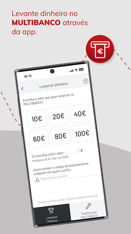 To use the "Utilizar MULTIBANCO” option with the MB WAY app, you must choose the amount you want to withdraw and enter your MB WAY PIN or touch ID. Then, with the generated code, go to a MULTIBANCO ATM, press the green key and choose the "Withdraw Money" option. You can also generate a code for someone else to go to MULTIBANCO to withdraw. You can also use this option “Utilizar MULTIBANCO” to carry out other operations available at MULTIBANCO.