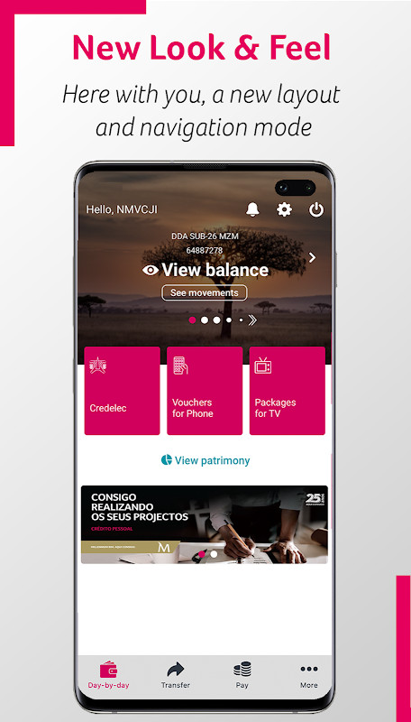 The new Smart IZI layout offers you a different navigation mode from the previous one. Now, after logging in, you can slide to the left or right on the products carousel and have an overview of all your products: accounts, cards, savings and loans. To make it even easier to navigate through the App, the new version of Smart IZI has a fixed navigation bar at the bottom of the screen where you can quickly access to "day-by-day", "transfer", " pay" and "more".