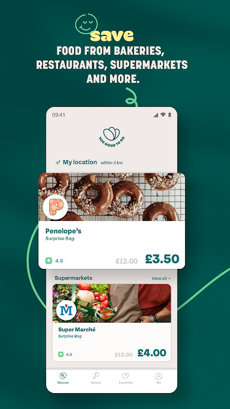 Too Good To Go is the free food recovery app that makes it easy to make a positive impact on the planet while saving money on your favourite foods. The #1 app for reducing food waste, you can save tasty unsold snacks, takeaway meals, and ingredients straight from shops, cafes, grocery stores, and restaurants in your area - all at an unbeatable price.